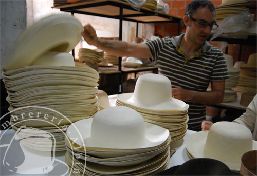 Hoy comenzaremos por el almacén de la fábrica. En el almacén se guarda la materia prima de la que partirá nuestro Sombrero: fieltros en forma de campana que se apilan en las estanterías, clasificados a la perfección por colores, calidades y procedencia. En el caso particular de Signes hemos visto fieltros traídos de diferentes partes del mundo, cada uno con sus características particulares para el tipo final de sombrero que se fabricará.