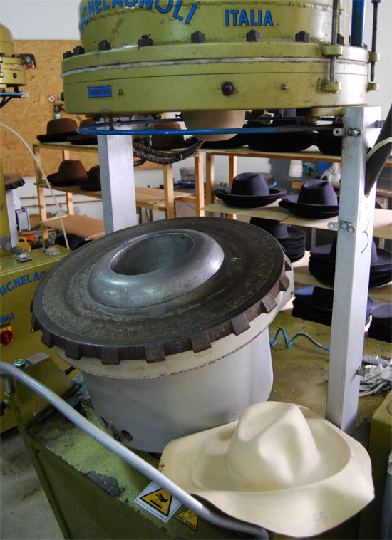 Para realizar el planchado se utilizan diferentes técnicas y maquinaria, que varía dependiendo de la calidad del fieltro o la paja. El planchado se realiza mediante calor y vapor que ablanda el material y fija la forma deseada en el sombrero. Los diferentes modelos de sombreros varían dependiendo de los moldes de los que disponga el fabricante, que acoplados a las planchas darán el aspecto final de copa y ala. Sobre estos moldes hemos hablado no hace mucho en el blog, ayudados de la información y las fotografías que nos envió «Hormas para Sombrero Gutiérrez» , por si también desea conocer el proceso de fabicación de las mismas. Antiguamente las hormas estaban confeccionadas en madera casi en su totalidad, pero hoy día se utilizan de aluminio, que puede soportar una mayor carga de trabajo sin deteriorarse, abandonando la madera, que se destina principalmente a la producción artesanal del Sombrero.