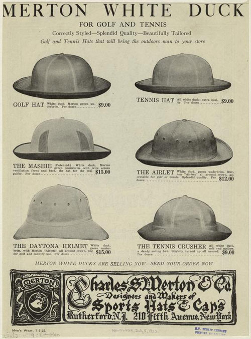 Y vean ahora un anuncio de sombreros para practicar tenis y golf de la época.