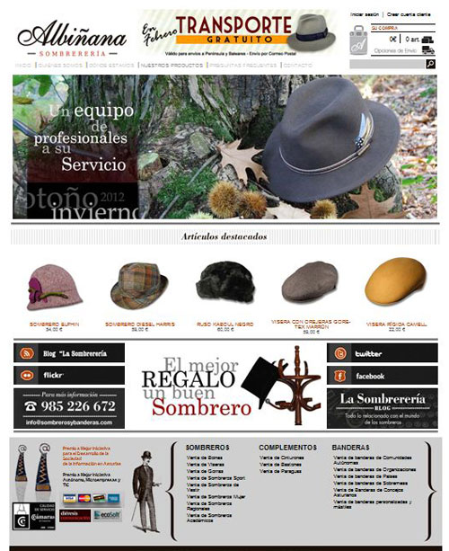En la nueva web de Albiñana además podrán encontrar uno de los mayores surtidos de Sombreros y Gorras. Con una navegación y un proceso de compra realmente sencillo, podrán adquirir sus productos con toda comodidad desde sus hogares. Sin sorpresas y con la confianza de saber que detrás de www.sombrerosybanderas.com se encuentra un equipo de profesionales dispuestos a ayudarle, que desde 1924 llevan atendiendo y asesorando a sus clientes.