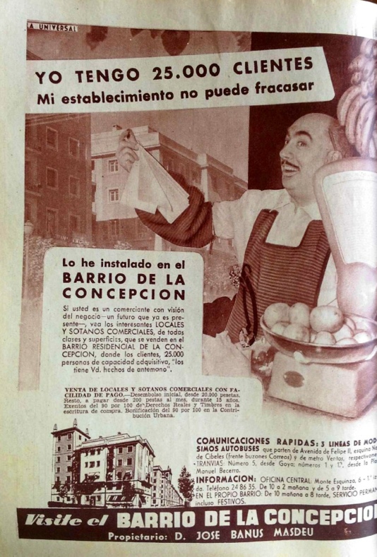 Hoy para ilustrar esto les traigo un anuncio publicado en el suplemento dominical del diario ABC del año 1956. Un anuncio dirigido a los profesionales del comercio donde se animaba a instalarnos en un barrio de nueva construcción.