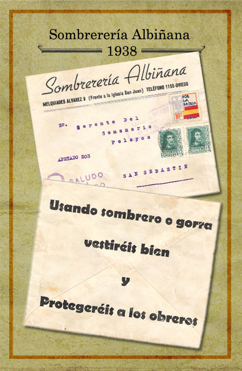 Hace unos días un profesor de mi etapa escolar se acercaba a mí en Oviedo y me anunciaba que había localizado un documento de Sombrerería Albiñana por la red, fechado en plena guerra civil española. A los pocos días me enviaba un enlace y podíamos ver asombrados que ciertamente se trataba de una carta enviada desde nuestra Sombrerería. Este documento estaba en poder de una tienda especializada en sellos, ubicada nada más y nada menos que en Holanda. Inmediatamente nos pusimos en contacto con el vendedor y realizamos la compra. Y esta semana regresaba de nuevo a Albiñana, 75 años después.