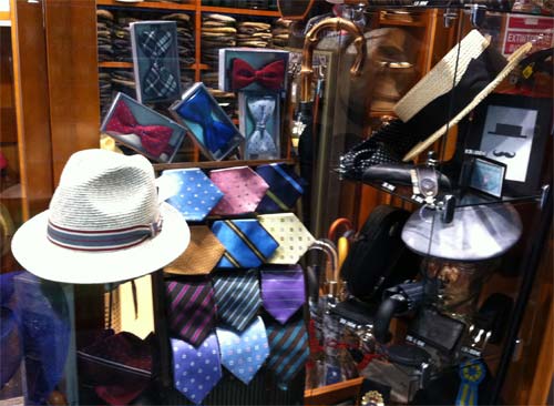 La vitrina está repleta de modelos para esta primavera y verano: sombreros, pamelas, tocados, gorras, acompañados por otro gran surtido de complementos como corbatas, lazos, pañuelos… a su disposición.