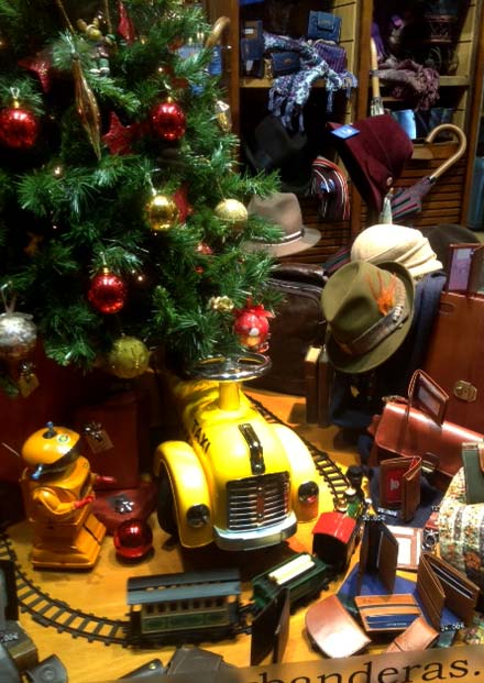 Para ello los llenamos de Sombreros y de regalos, pero con algo especial: un tren eléctrico que circula entre los modelos de Sombreros para el inverno. El tren ha causado sensación, a tenor de la cantidad de huellas de pequeños dedos y narices que encontramos en el escaparate. Un placer ver cómo los niños, y los no tan niños, se detienen delante del cristal y pegan sus narices para ver cómo el tren gira y gira entre Sombreros.